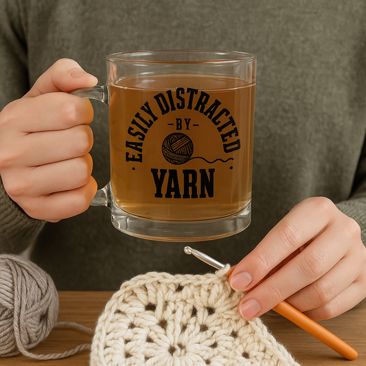 Easily Distracted by Yarn" Glass Mug 10oz Clear Coffee Cup for Knitters & Yarn Lovers Perfect Knitting Gift