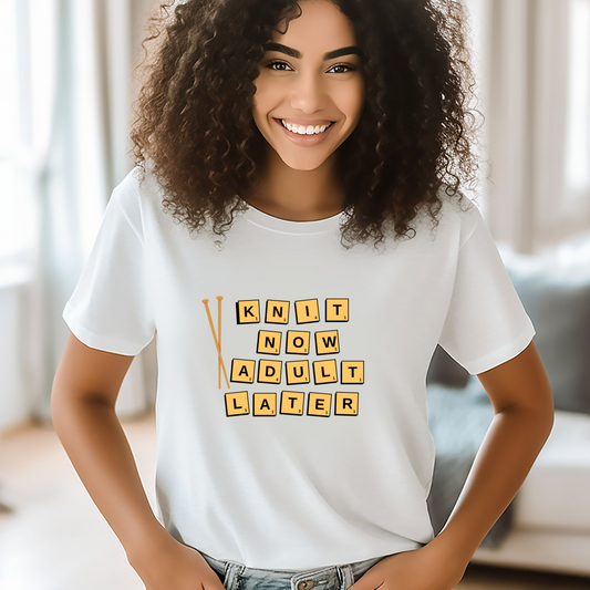 Knit Now Adult Later T-Shirt – Funny Knitting Gift for Crafters, Yarn Lovers & Makers